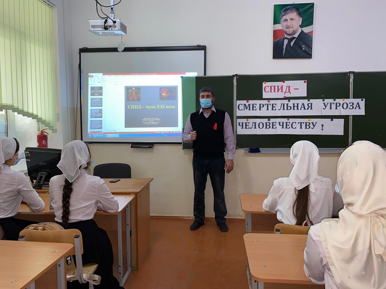 Перед учащимися 9 классов выступил Абубакаров М.Л., учитель биологии с беседой «СПИД – чума XXI века». В заключении мероприятия было проведено анкетирование. В школе был оформлен стенд «Школьная жизнь» информационный бюллетень «СПИД- смерть!». В целом мероприятия прошли насыщено и интересно.