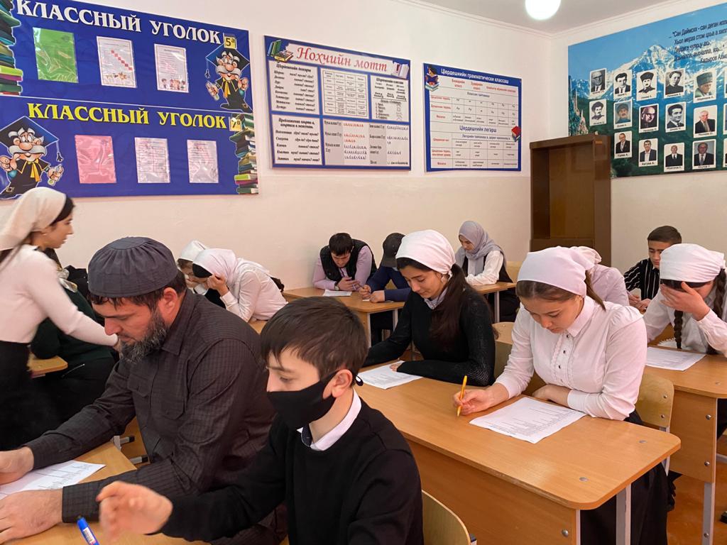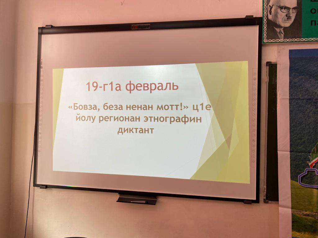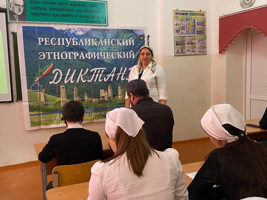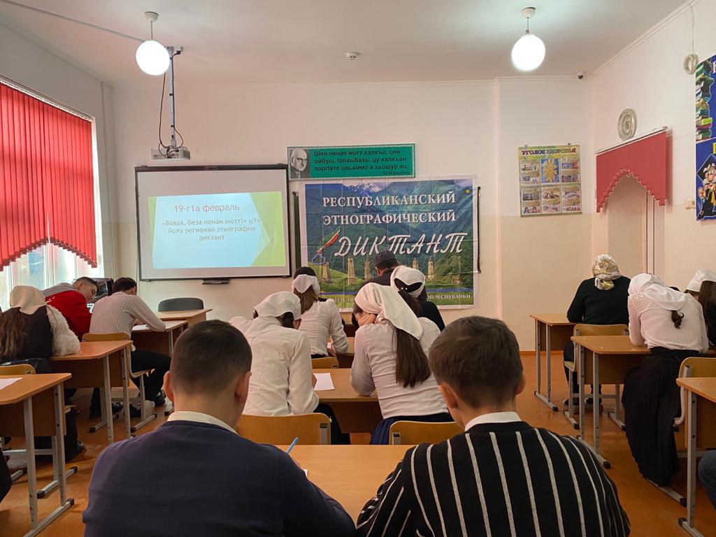 В рамках празднования Дня чеченского языка, с целью повышения интереса к изучению родного языка и литературы, истории и этнографии Чеченской Республики, углубления знаний в этой области, улучшения культуры письменной речи и общей грамотности 19 февраля 2021 года в МБОУ "ООШ с.Мескер-Юрт Шалинского муниципального района" проведён этнографический диктант "Бовза, беза ненан мотт!". В мероприятии приняли участие учащиеся, родители и педколлектив школы.