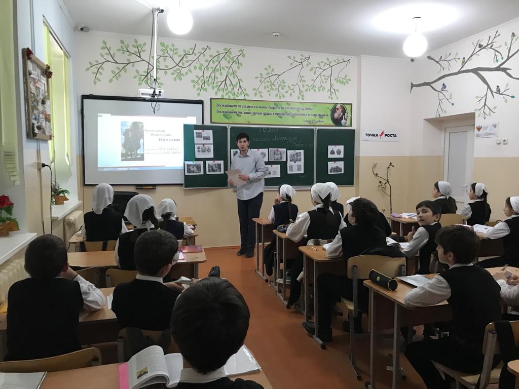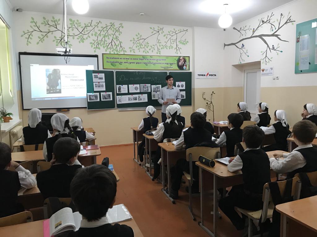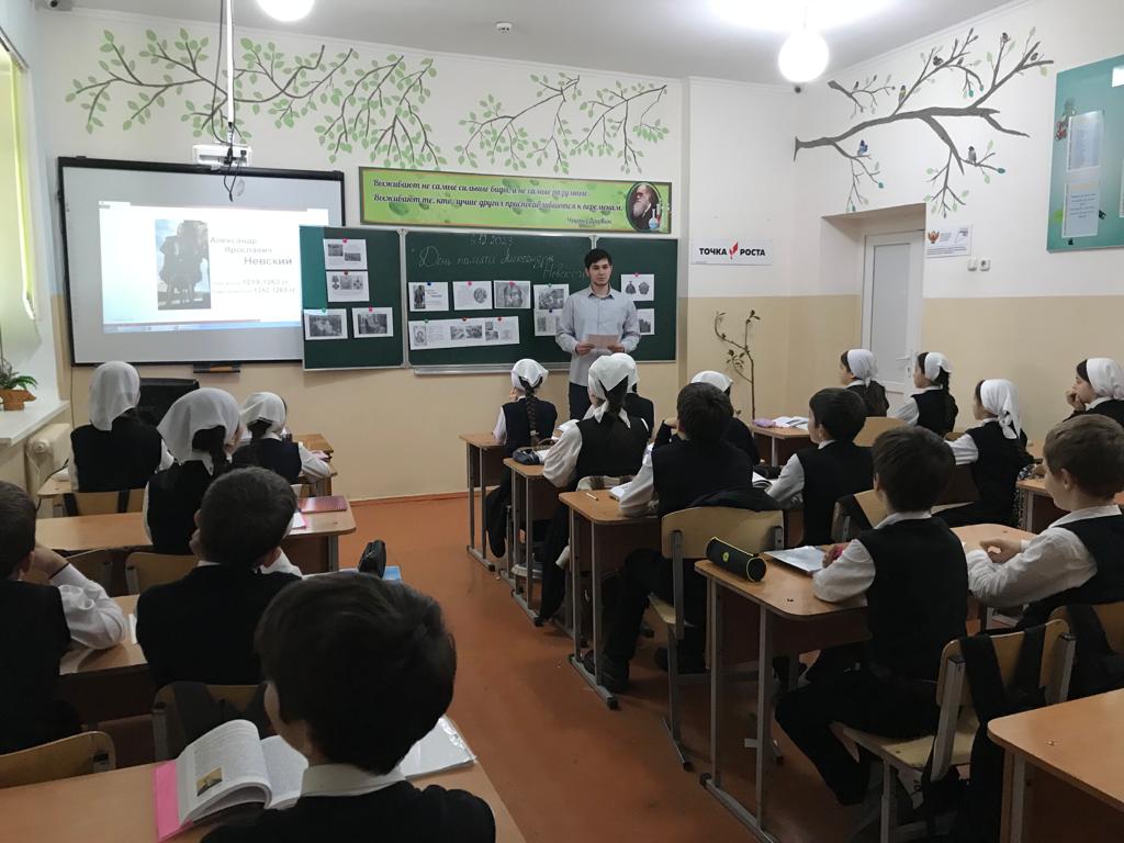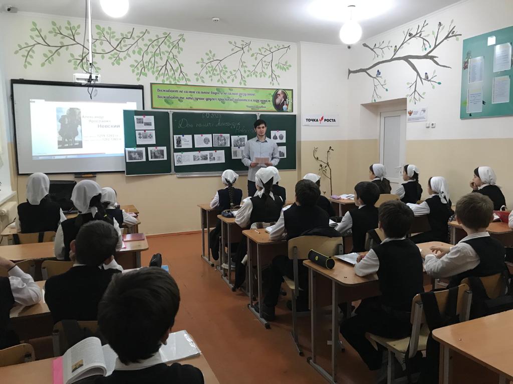 6 декабря 2023г. учитель истории Тимерсултанов С-А.Р. для учащихся 8-х классов провела исторический час «День памяти - Александра Невского». Сайд-Арби Русланович познакомил ребят с личностью великого полководца. Рассказал каким было его детство, как отец готовил его к княжению и будущим военным подвигам. Так же дети узнали о победах Александра в Невской битве 1240 года и Ледовом побоище 1242 года. В заключение мероприятия, ребята активно приняли участие в юбилейной викторине «Святой витязь – А. Невский». Отрадно отметить, что на большинство вопросов дети давали правильные ответы.