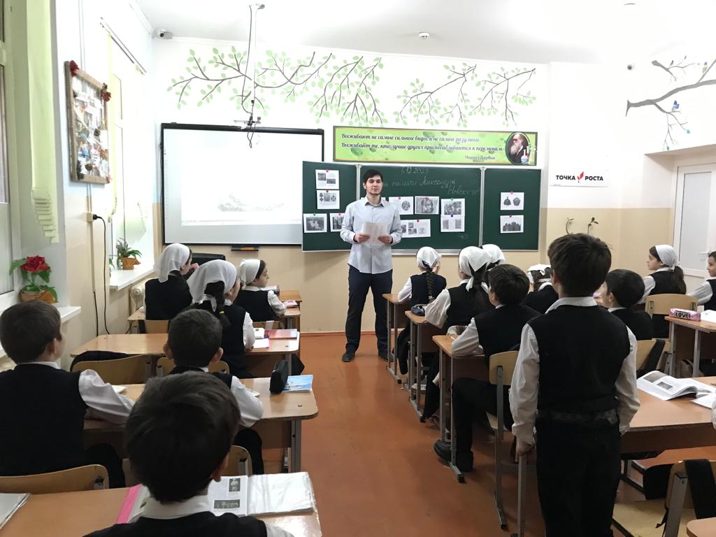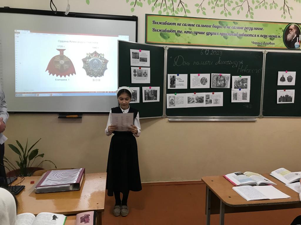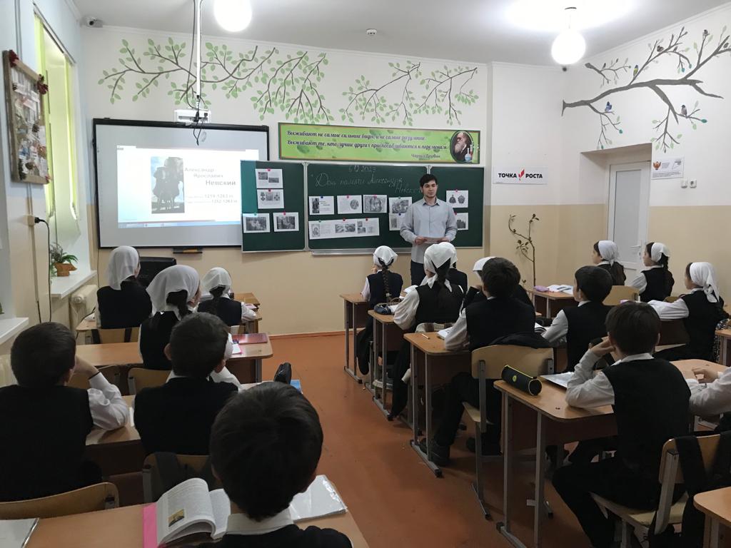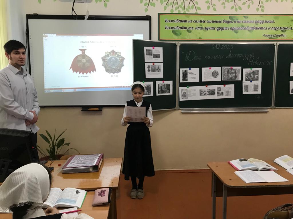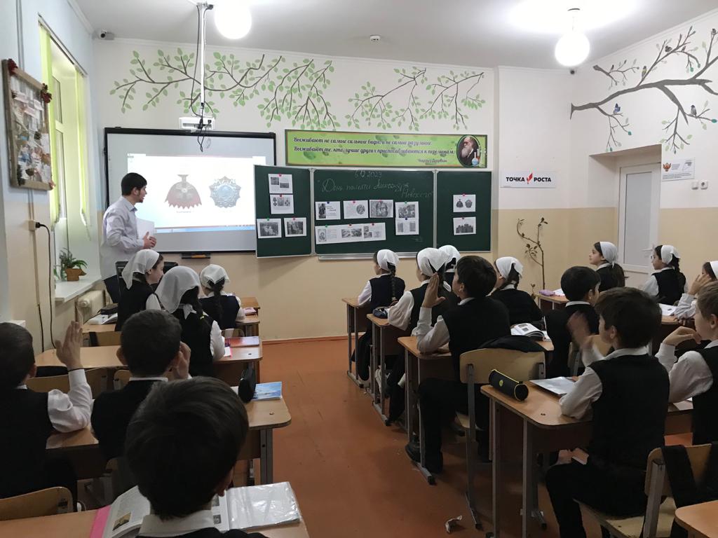 6 декабря 2023г. учитель истории Тимерсултанов С-А.Р. для учащихся 8-х классов провела исторический час «День памяти - Александра Невского». Сайд-Арби Русланович познакомил ребят с личностью великого полководца. Рассказал каким было его детство, как отец готовил его к княжению и будущим военным подвигам. Так же дети узнали о победах Александра в Невской битве 1240 года и Ледовом побоище 1242 года. В заключение мероприятия, ребята активно приняли участие в юбилейной викторине «Святой витязь – А. Невский». Отрадно отметить, что на большинство вопросов дети давали правильные ответы.