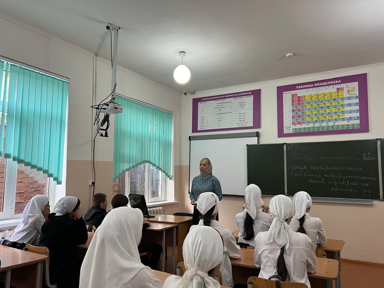 16.05.2024Отделом в Шалинском районе УФСБ России по Чеченской Республике совместно с МУ «Отдел образования Шалинского муниципального района Чеченской Республики» проведено профилактическое мероприятие в МБОУ "ООШ с.мескер-Юрт". на тему: «О недопущении вовлечения несовершеннолетних в совершение террористических актов и диверсий на территории РФ».
